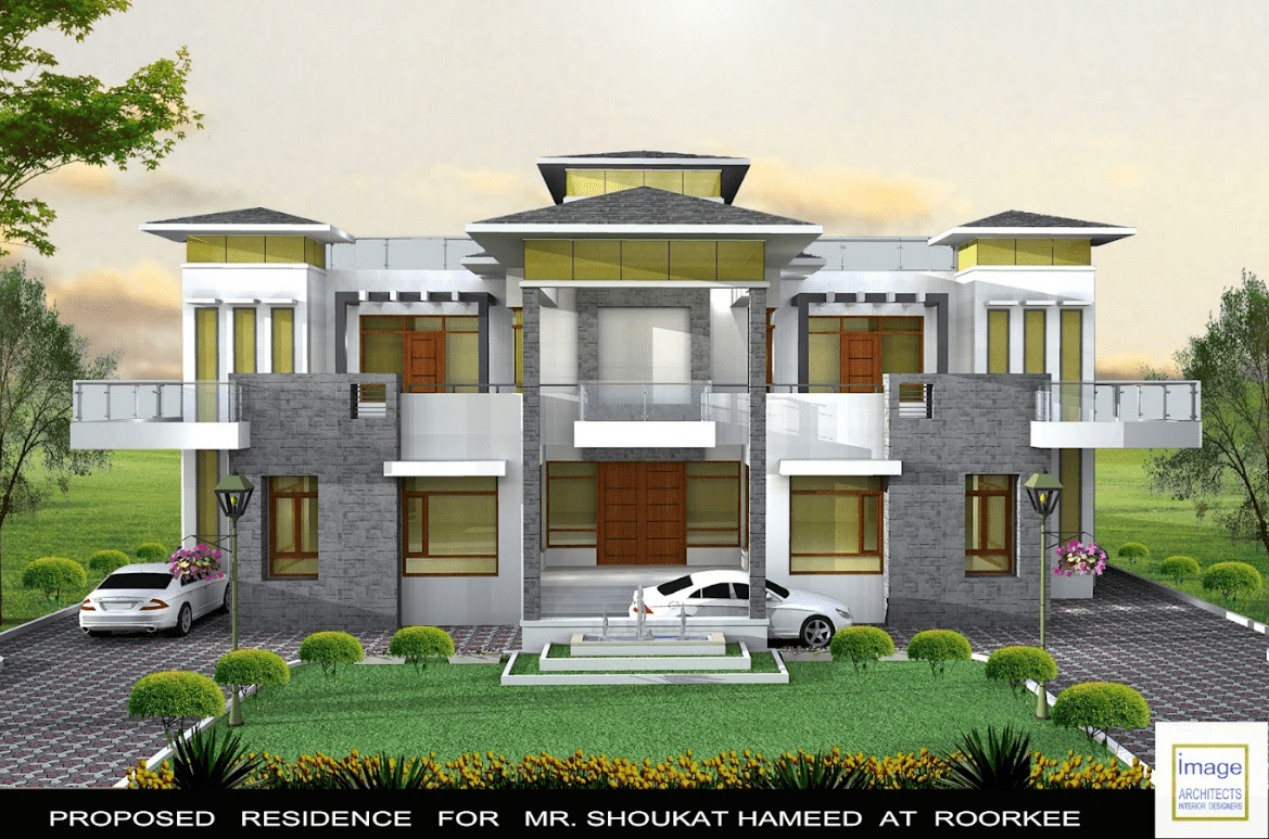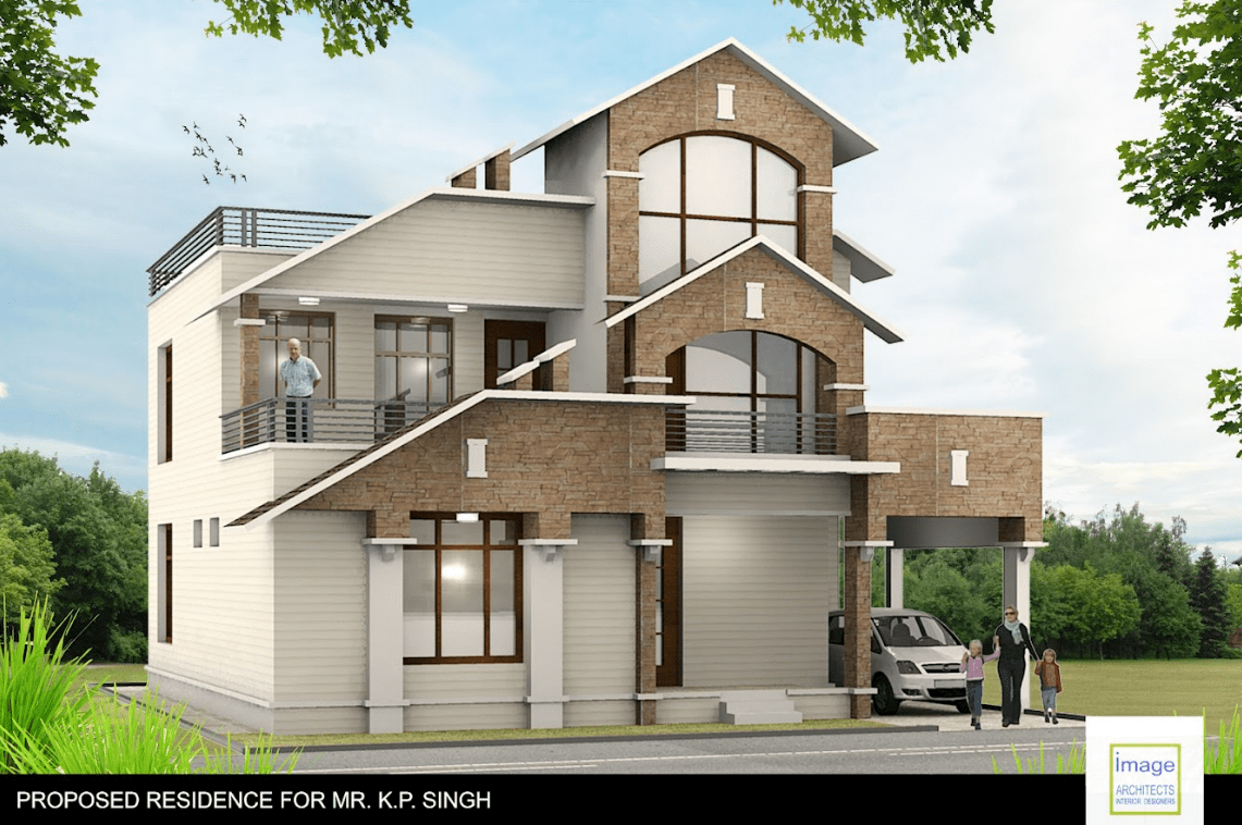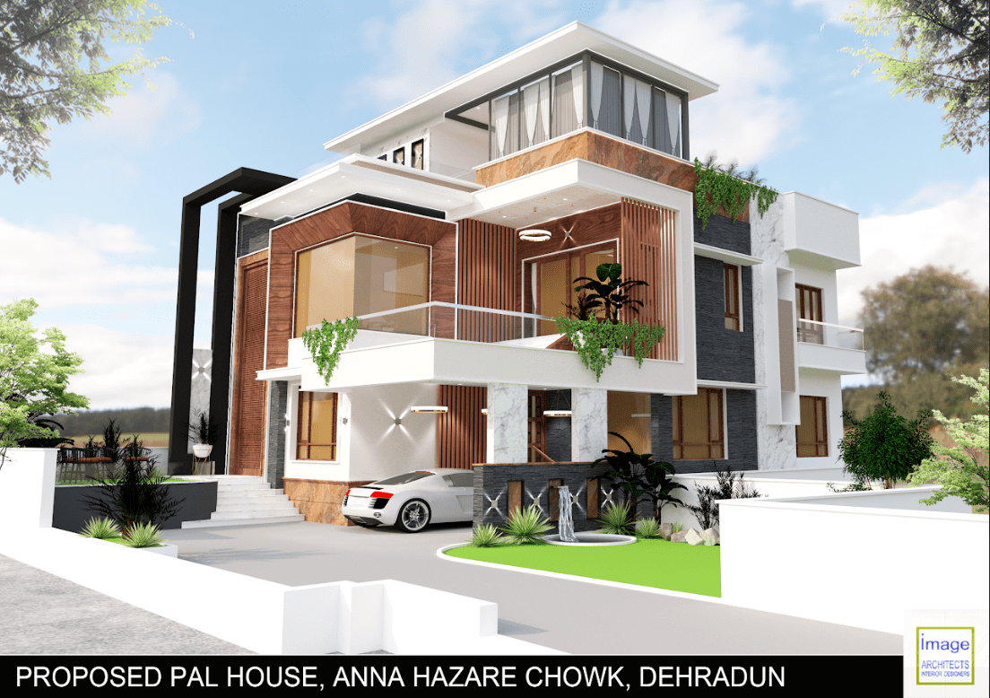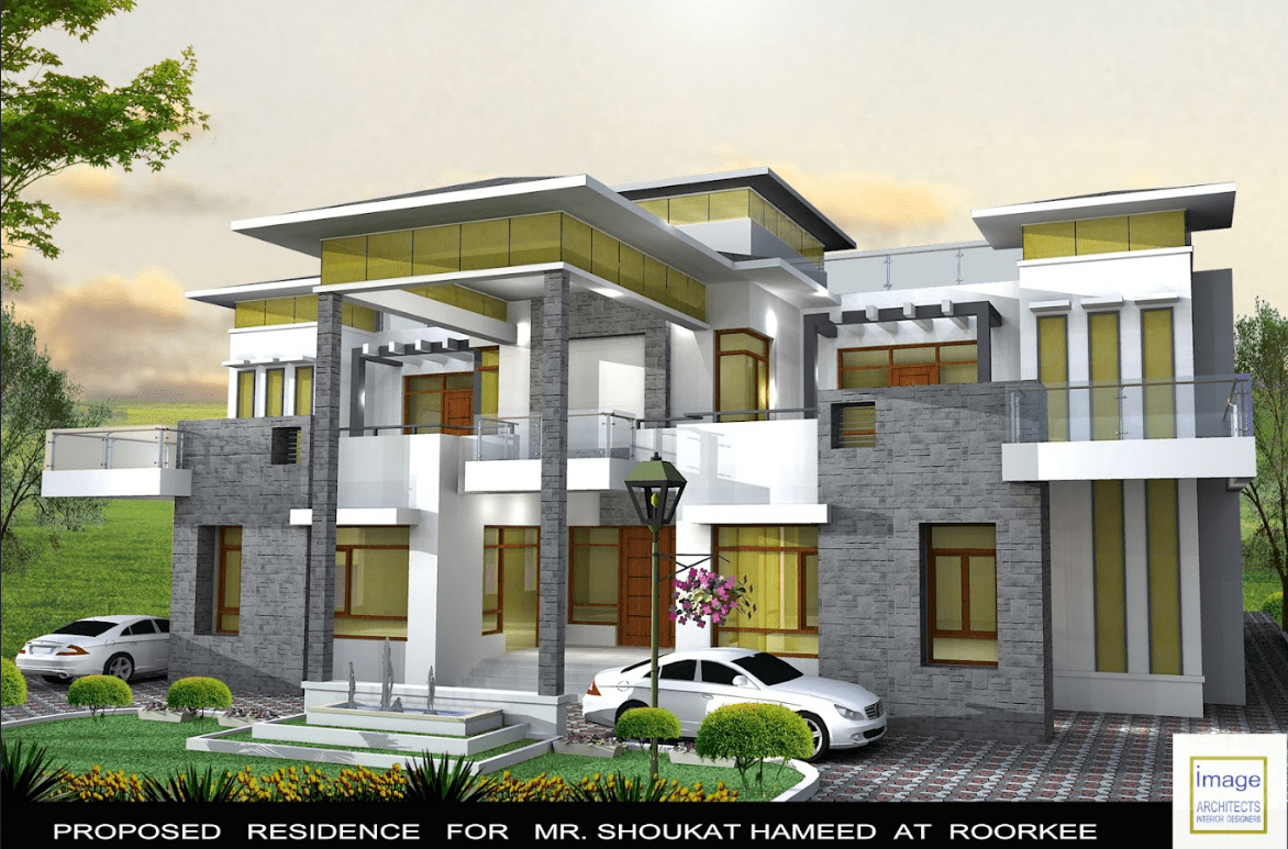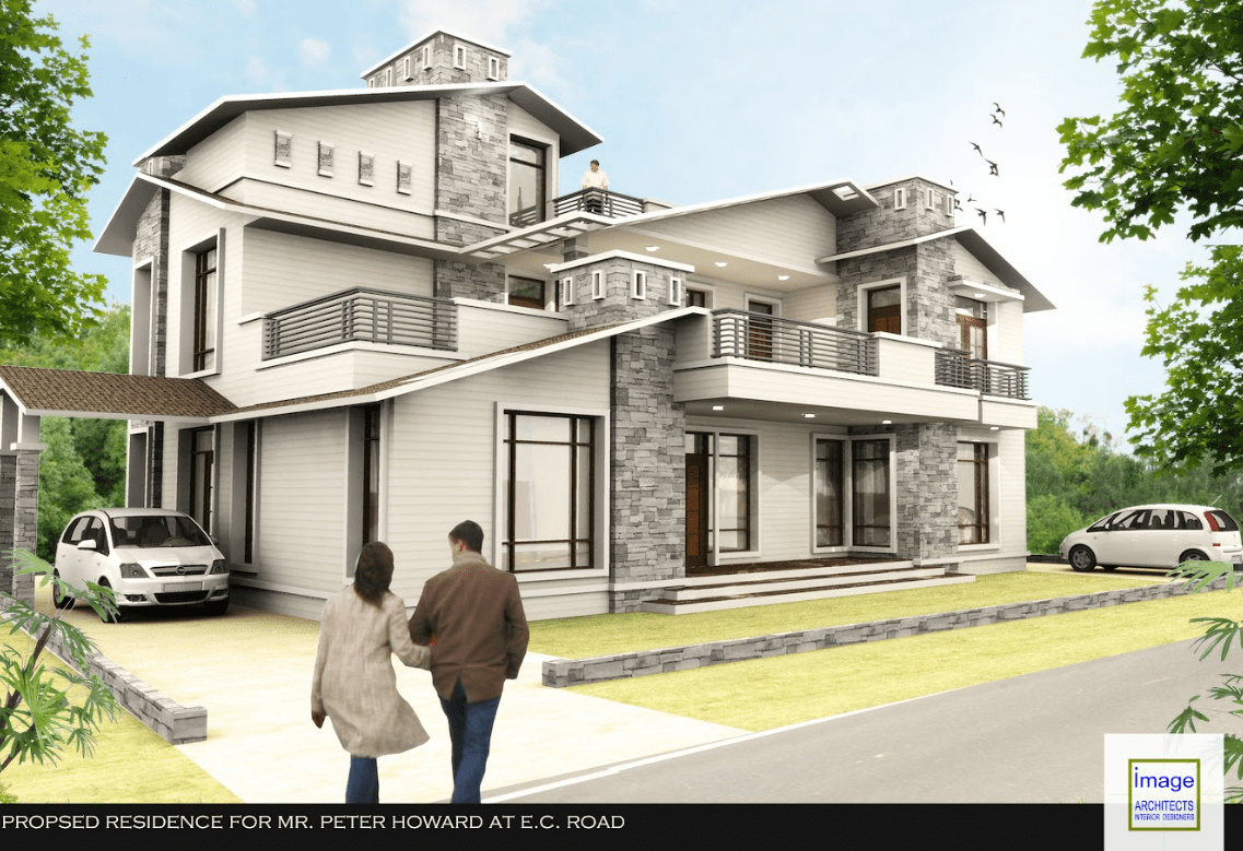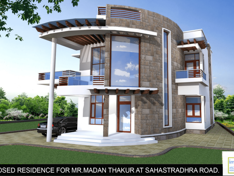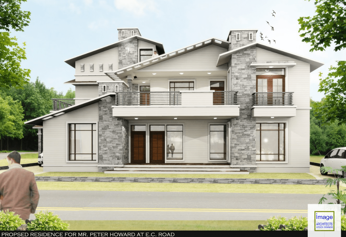 This contemporary house design with use of castle stone work creates a unique and striking